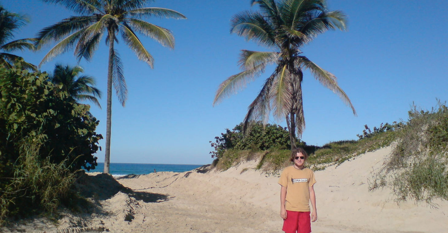 Hier noch ein Bild wie auf der Ansichtskarte, Palmen, Strand, Sonne, Meer… und Oli in Badehose mit rotgebrannten Beinen;-)!